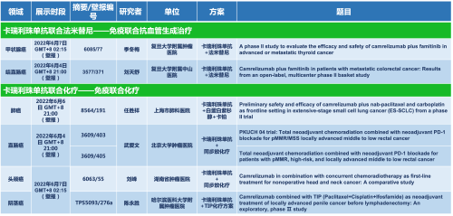 卡瑞利珠单抗联合PG医药的另一款创新药法米替尼在甲状腺癌和结直肠癌领域有2项研究被接收为壁报,另有卡瑞利珠单抗联合化疗的4项研究在肺癌、结直肠癌、头颈癌和阴茎癌领域的研究被接收为5份壁报。