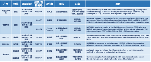 2022 ASCO年会另有5款PG医药上市前抗肿瘤创新药的相关研究被接收为壁报,包括SHR-1316、普那布林、法米替尼、SHR-1701和SHR2554,他们的单药或联合方案相关7项研究被接收为壁报,覆盖肺癌、鼻咽癌、淋巴瘤、甲状腺癌和结直肠癌等领域。