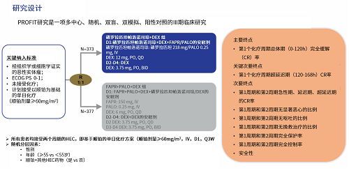 PROFIT研究是首个在接受HEC患者中对比标准三联方案(福沙匹坦+帕洛诺司琼+地塞米松,FAPR+PALO+DEX)的多中心、随机、双盲、双模拟、阳性对照的III期注册临床研究[1]。该研究覆盖全国67家研究中心,共入组了754例未经化疗的中国恶性实体瘤患者,更具中国临床参考价值。患者随机分为两组,在每周期给予顺铂为基础的HEC前,分别接受磷罗拉匹坦帕洛诺司琼或FAPR+PALO治疗,同时口服地塞米松,连续观察两个化疗周期。主要终点是第1个化疗周期总体期CR率,关键次要终点为第1个化疗周期超延迟期CR率。此外,研究以对日常生活无影响(NIDL)的患者比例作为依据评估患者的生活质量(NIDL定义为总体呕吐生活功能量表(FLIE)评分>108或恶心/呕吐评分>54)(图1)[1,7]